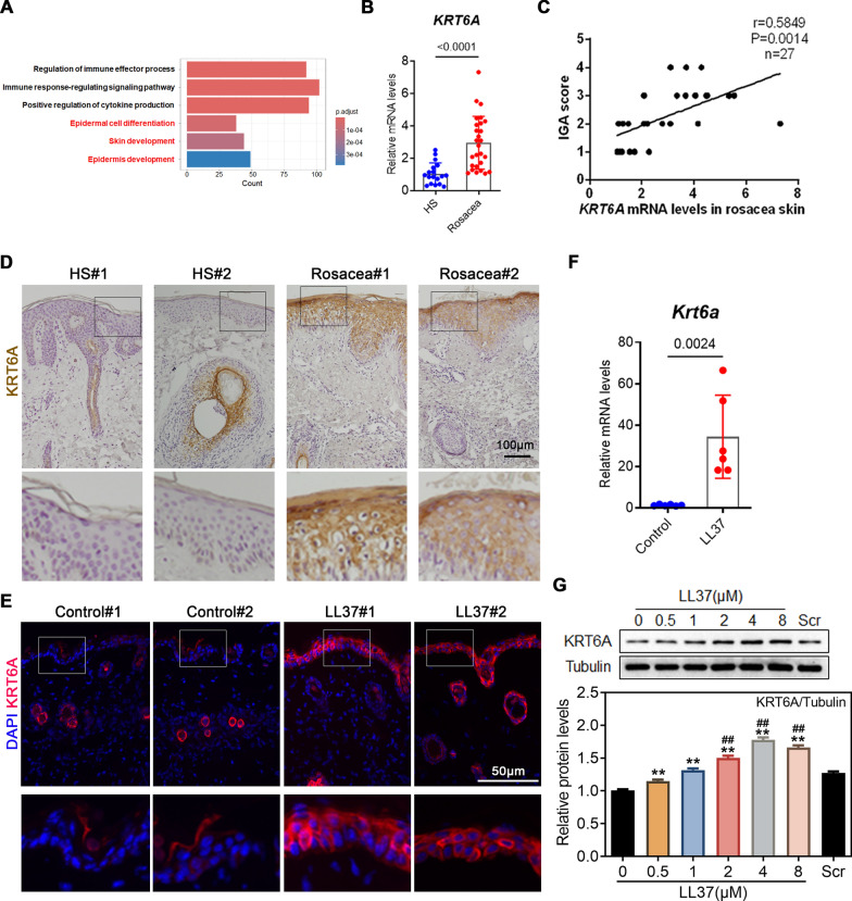 Methods: We treated mouse skin and human keratinocytes, with and without KRT6A expression, with LL37/TNF-α and assessed the severity of inflammation. The specific mechanism by which KRT6A promotes skin inflammation was investigated using mass spectrometry and immunoprecipitation assays.
