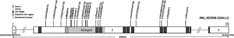 - Botzenhart EM, Bartalini G, Blair E, Brady AF, Elmslie F, Chong KL, et al. Townes-Brocks syndrome: twenty novel SALL1 mutations in sporadic and familial cases and refinement of the SALL1 hot spot region. Hum Mutat. 2007;28:204–5. - PubMed
