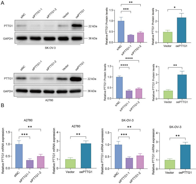 Epithelial Ovarian Cancer (EOC) is complex and heterogeneous, making accurate prognosis and treatment prediction difficult. New therapeutic targets and their mechanisms are urgently needed. This study explored the role of PTTG1 in ovarian cancer via the cGMP-PKG signaling pathway, focusing on its effects on M2 macrophage polarization and EMT progression in EOC cells. Using the GSE135886 database, we performed differential gene expression, pathway enrichment, and immune infiltration analyses to identify key targets influencing EMT and macrophage polarization. We then constructed PTTG1 knockdown and overexpression cell lines to assess the impact of PTTG1 on cell proliferation, migration, invasion, EMT, and macrophage polarization in vitro. Analysis revealed that differentially expressed genes were enriched in the cGMP-PKG pathway and correlated with M2 macrophages. PTTG1 overexpression in A2780 and SK-OV-3 ovarian cancer cells promoted proliferation, invasion, and migration, while enhancing sGC, PKG1, and PKG2 expression to activate the cGMP-PKG pathway and induce M2 macrophage polarization. PTTG1 knockdown produced opposite results, reinforcing our conclusions. This study uncovers a novel mechanism of PTTG1 in ovarian cancer development and suggests it as a potential therapeutic target.