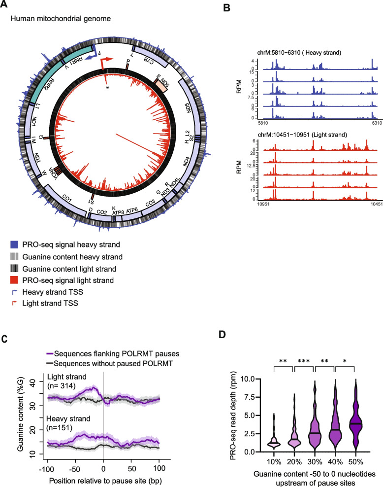 Conclusions: Our findings connect RNA guanine quadruplex-mediated pausing with the regulation of POLRMT transcription and mitochondrial function. We demonstrate that tuning of quadruplex dynamics in nascent RNA, rather than template DNA upstream of the polymerase, is sufficient to regulate mitochondrial gene expression.