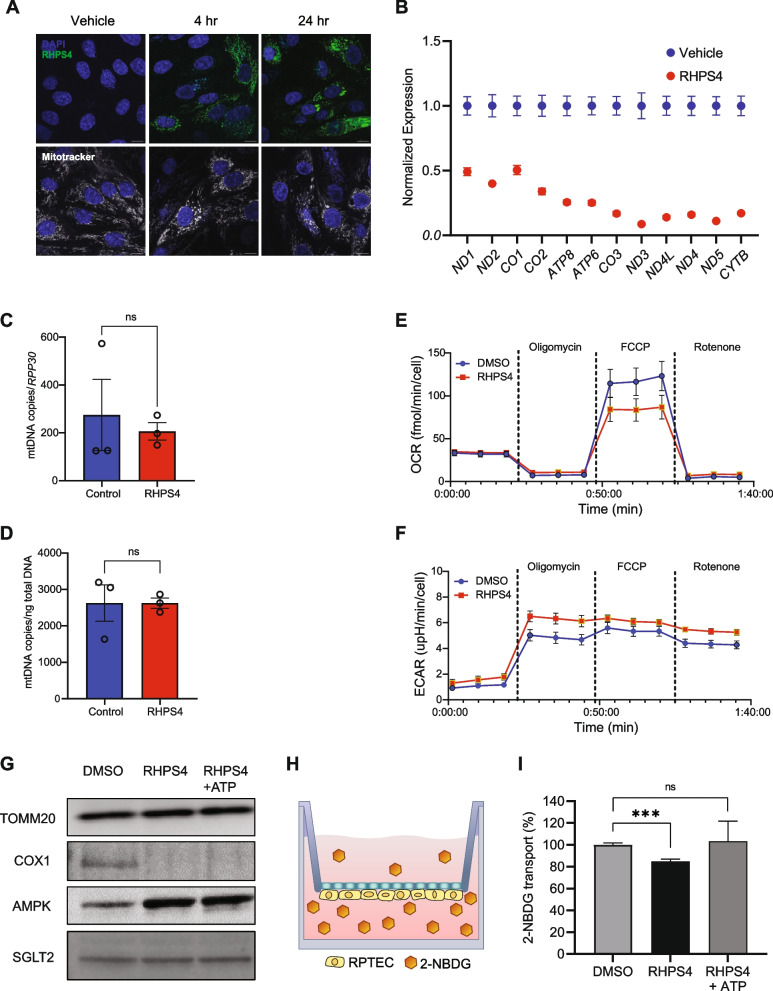 Results: We examined mitochondrial RNA polymerase (POLRMT) pausing patterns in primary human skin fibroblast cells using the precision nuclear run-on assay and uncovered over 400 pause sites on the mitochondrial genome. We identified that these pauses frequently occur following guanine-rich sequences where quadruplexes form. Using an in vitro primer extension assay, we show that quadruplexes formed in nascent RNA act as mediators of POLRMT pausing, and in cell-based assays their stabilization disrupts POLRMT transcription. Cells exposed to a guanine-quadruplex stabilizing agent (RHPS4) had diminished mitochondrial gene expression and significantly lowered cellular respiration within 24 h. The resulting ATP stress was sufficient to reduce active transport in renal epithelia.