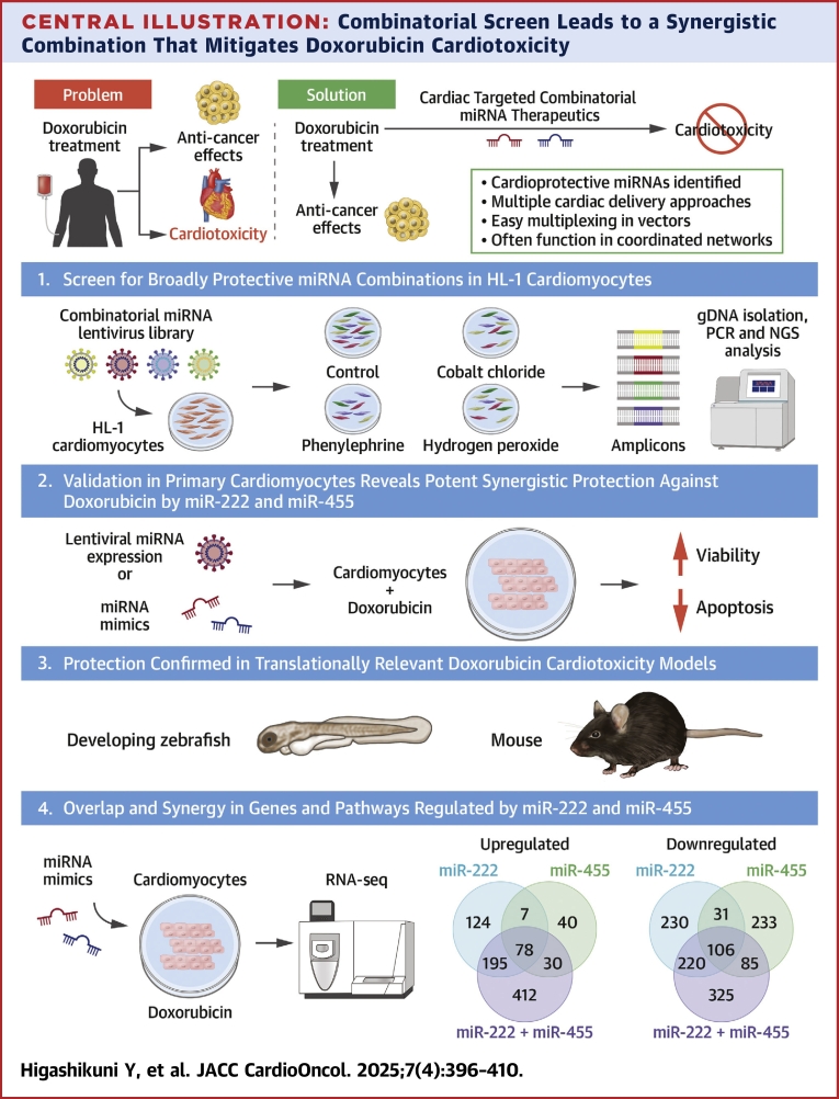 Results: Multiple miRNA combinations protected cardiomyocytes from doxorubicin in vitro. The most effective (miR-222+miR-455) appeared to act synergistically, and mitigated doxorubicin cardiotoxicity phenotypes in murine and zebrafish in vivo models. RNA sequencing revealed overlapping and synergistic regulation of relevant genes and biological processes in cardiomyocytes, including mitochondrial homeostasis, oxidative stress, muscle contraction, and others.