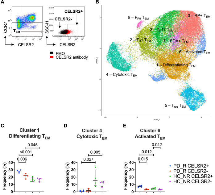 Parkinson's disease (PD) is a complex neurodegenerative disease with a largely unknown etiology. Although the loss of dopaminergic neurons in the substantia nigra pars compacta is the pathological hallmark of PD, neuroinflammation also plays a fundamental role in PD pathology. We have previously reported that PD patients have increased frequencies of T cells reactive to peptides from α-synuclein (α-syn). However, not all PD participants respond to α-syn. Furthermore, we have previously found that CD4 T cells from PD participants responding to α-syn (PD_R) are transcriptionally distinct from PD participants not responding to α-syn (PD_NR). To gain further insight into the pathology of PD_R participants, we investigated surface protein expression of 11 proteins whose genes had previously been found to be differentially expressed when comparing PD_R and healthy control participants not responding to α-syn (HC_NR). We found that Cadherin EGF LAG seven-pass G-type receptor 2 (CELSR2) was expressed on a significantly higher proportion of CD4 effector memory T cells (TEM) in PD_R compared to HC_NR. Single-cell RNA sequencing analysis of cells expressing or not expressing CELSR2 revealed that PD_R participants have elevated frequencies of activated TEM subsets and an almost complete loss of cytotoxic TEM cells. Flow cytometry analyses confirmed that Granulysin+ CD4 cytotoxic TEM cells are reduced in PD_R. Taken together, these results provide further insight into the perturbation of T cell subsets in PD_R, and highlights the need for further investigation into the role of Granulysin+ CD4 cytotoxic TEM in PD pathology.