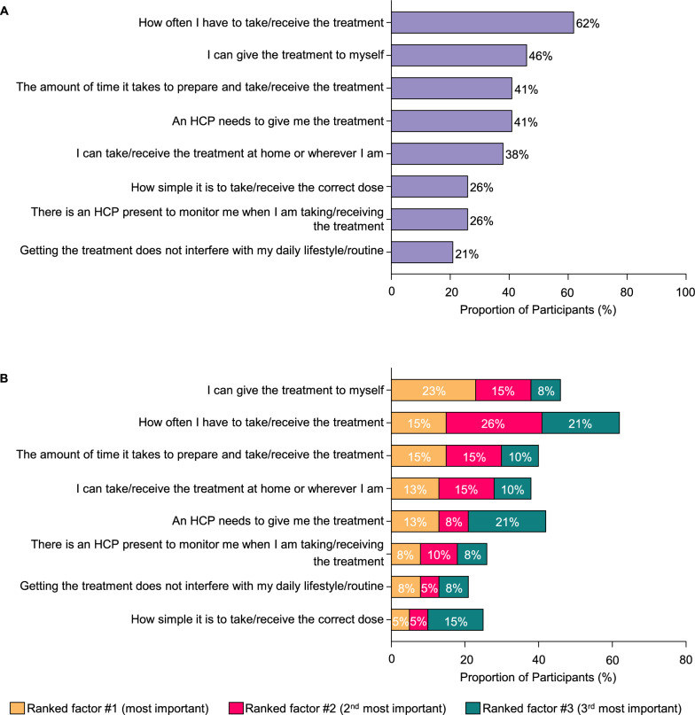 Results: The study participants (N = 39) included both male (N = 26) and female (N = 13) adults with PH1. Participants came from a range of community settings, including urban (46%), rural (39%), and suburban (15%); and were full- or part-time workers (56%) or students (41%). Most participants were on lumasiran therapy (95%) for an average of 1 year (range: 0.3-1.8 years). The survey revealed that the commonly reported factors important for treatment selection among participants living with PH1 were frequency of administration, treatment administrator, time required for treatment, and place of administration. The ability to self-administer was ranked as the top choice by most participants. Over half (56%) found quarterly injections easy or very easy. Similarly, 56-59% found home administration, whether self- or healthcare provider (HCP)-administered, easy or very easy. Nearly half (46%) considered injections at medical facilities challenging or very challenging. The majority indicated traveling > 15 min for injections would be burdensome (57%) and arranging appointments problematic (54%). When comparing administration methods, 72% preferred self-injection over HCP-administered injections. Regarding treatment regimens, 57% found it easy or very easy to receive monthly injections initially, before switching to quarterly. Additionally, 64% preferred a medication dosage that is not weight-based. While participants expressed a preference for less frequent treatments, 67% preferred self-injection at home over medical facility injections, and 67% preferred monthly injections at home over quarterly injections at a medical facility.