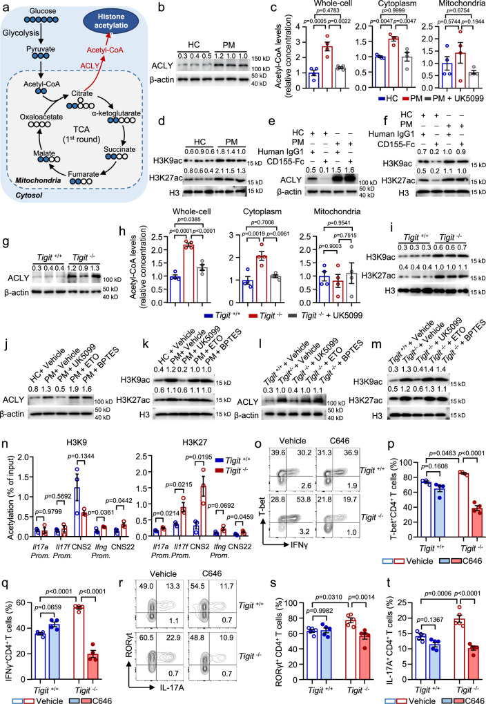 Polymyositis (PM) is a systemic autoimmune disease characterized by muscular inflammatory infiltrates and degeneration. T-cell immunoreceptor with Ig and ITIM domains (TIGIT) contributes to immune tolerance by inhibiting T cell-mediated autoimmunity. Here, we show that a reduced expression of TIGIT in CD4+ T cells from patients with PM promotes these cells' differentiation into Th1 and Th17 cells, which could be rescued by TIGIT overexpression. Knockout of TIGIT enhances muscle inflammation in a mouse model of experimental autoimmune myositis. Mechanistically, we find that TIGIT deficiency enhances CD28-mediated PI3K/AKT/mTOR co-stimulatory pathway, which promotes glucose oxidation, citrate production, and increased cytosolic acetyl-CoA levels, ultimately inducing epigenetic reprogramming via histone acetylation. Importantly, pharmacological inhibition of histone acetylation suppresses the differentiation of Th1 and Th17 cells, alleviating muscle inflammation. Thus, our findings reveal a mechanism by which TIGIT directly affects the differentiation of Th1 and Th17 T cells through metabolic‒epigenetic reprogramming, with important implications for treating systemic autoimmune diseases.