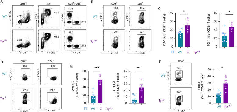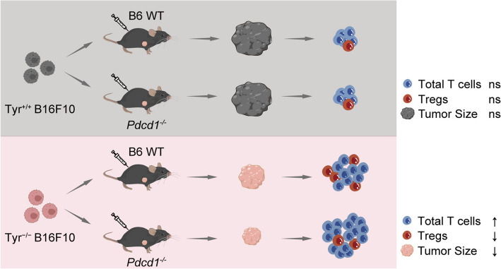 Results: In this study, we generated tyrosinase knockout B16 melanoma cells using CRISPR/Cas9 and discovered that tyrosinase in melanoma significantly inhibits the anti-tumor activity of T cells. Tyrosinase deficiency leads to a 3.80-fold increase in T-cell infiltration and enhances T-cell activation within the tumor. Single-cell RNA sequencing reveals an altered cold tumor immunophenotype in tyrosinase-deficient B16 melanoma. In wild-type mice, T cells in tyrosinase-deficient tumors express elevated levels of PD-1 and Foxp3. However, strikingly, in PD-1 deficient mice, the loss of tyrosinase in B16 melanoma unleashes the anti-tumor activity of PD-1 deficient T cells. This enhanced anti-tumor activity is explained by significantly increased tumor T cell infiltration accompanied by reduced frequencies of regulatory T cells in PD-1 knockout mice.