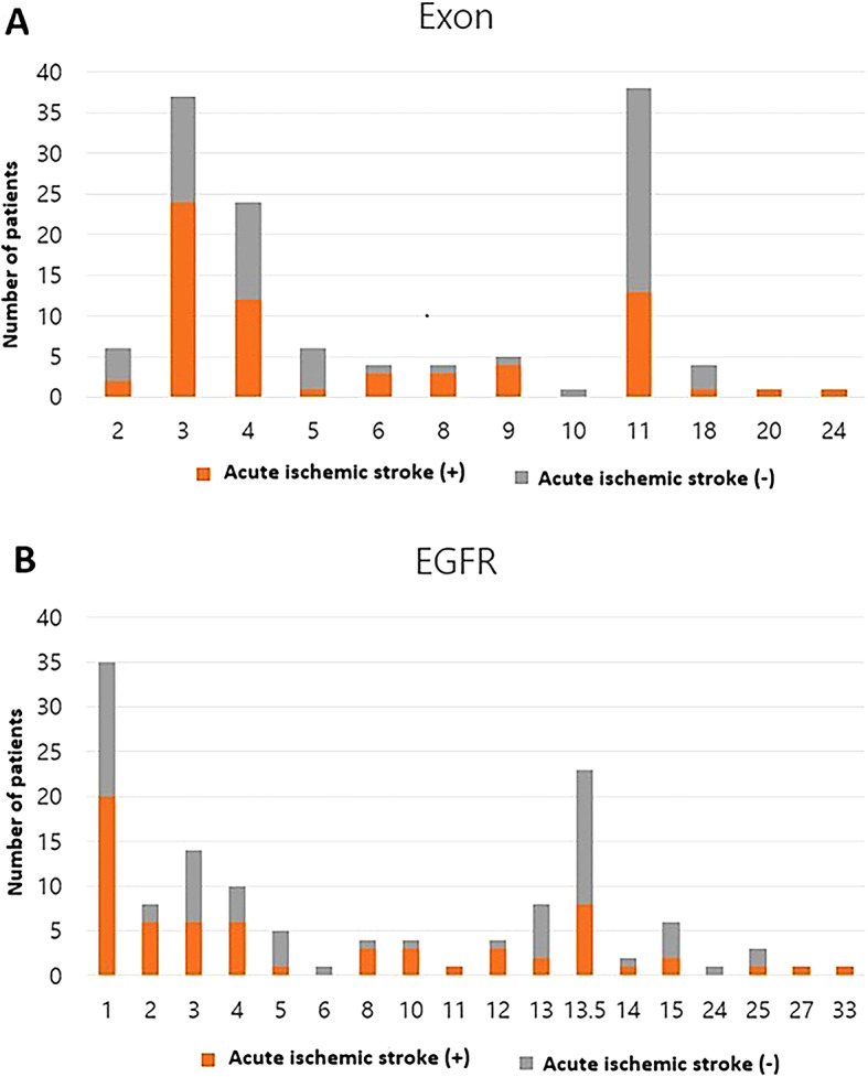 Cerebral autosomal dominant arteriopathy with subcortical infarcts and leukoencephalopathy (CADASIL), which is caused by mutations in the NOTCH3 gene, is associated with early-onset strokes. However, the specific genetic and imaging characteristics associated with acute ischemic stroke (AIS) in patients with CADASIL remain unclear. We reviewed CADASIL patients with NOTCH3 mutations, dividing them into two groups based on the presence of clinically relevant AIS lesions on diffusion-weighted imaging, observed at any time, regardless of the timing of CADASIL diagnosis. Clinical, imaging, and genetic features were compared between these groups. Genetic variations were categorized by exon location: specifically, exon 3 including Arg75Pro, and exon 11 including Arg544Cys, were examined in detail. Factors associated with AIS in CADASIL patients were analyzed. A total of 141 patients were included, of whom 70 (49.6%) were diagnosed with AIS. While there were no significant differences in vascular risk factors between the two groups, patients with AIS had a higher prevalence and greater number of lacunes (p < 0.001) and exhibited more severe white matter changes (p = 0.007). CADASIL patients with AIS had a higher rate of exon 3 variant and a lower rate of exon 11 variant compared to those without AIS. Multivariable analysis revealed that exon 11 variants were associated with a reduced risk (aOR = 0.270, 95% CI 0.099-0.733; p = 0.010). CADASIL who experienced AIS had unique genetic and imaging characteristics when compared to those who did not experience AIS.