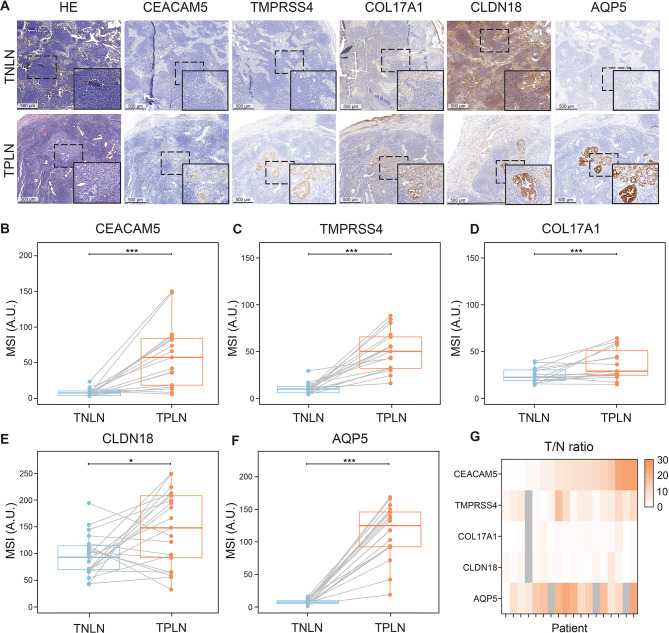 Pancreatic ductal adenocarcinoma (PDAC) is an aggressive malignancy with a 5-year survival rate of approximately 5-7%, and complete surgical resection remains the only curative treatment but is often unfeasible. Fluorescence-guided surgery (FGS) using tumor-targeted probes may improve tumor visualization and facilitate complete resection. This study aimed to identify and validate tumor targets for FGS during PDAC resection procedures. RNA expression data from over 4000 cell surface genes, obtained from public genomic databases, were analyzed to identify genes encoding PDAC-associated proteins. Eleven potential tumor targets were identified, including CEACAM5, TMPRSS4, COL17A1, CLDN18, and AQP5. Protein expression was evaluated by immunohistochemistry (IHC) in tissues from 44 PDAC and 7 chronic pancreatitis (CP) patients. All targets, except COL17A1, showed significantly higher expression in PDAC tissue compared to healthy pancreatic, CP, and duodenal tissue (p < 0.001), as well as in tumor-positive versus tumor-negative lymph nodes. Especially CEACAM5, TMPRSS4, and AQP5 were identified as the most promising targets for distinguishing PDAC from healthy tissues and detecting lymph node metastasis during FGS. The development of probes targeting multiple markers, such as AQP5 with CEACAM5 and/or TMPRSS4, may help overcome interpatient variability and enhance detection across patients.