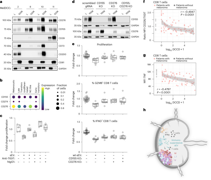 To investigate the early, poorly understood events driving metastatic progression, we searched for the earliest detectable disseminated cancer cells (DCCs), also often referred to as disseminated tumor cells (DTCs), in sentinel lymph node (SLN) biopsies of 492 patients with stage I-III melanoma. Using micromanipulator-assisted isolation of rare DCCs, single-cell mRNA and DNA sequencing, codetection by indexing immunofluorescence imaging and survival analysis, we identified melanoma-associated chondroitin sulfate proteoglycan (MCSP)+ melanoma cells as metastasis founder cells (MFCs). We found that DCCs entering SLNs predominantly exhibited a transitory phenotype that, upon interferon-γ exposure triggered by CD8 T cells, dedifferentiated into a neural-crest-like phenotype. This was accompanied by increased production of small extracellular vesicles (sEVs) carrying the immunomodulatory proteins CD155 and CD276 but rarely programmed cell death protein 1 ligand 1. The sEVs suppressed CD8 T cell proliferation and function, facilitating colony formation. Targeting MCSP+ MFCs or their immune escape mechanisms could be key to curing melanoma early by preventing manifestation of metastasis.