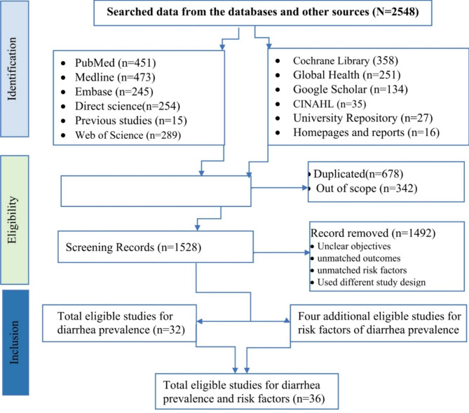Result: Out of 2548 studies, 36 studies were eligible for the review from north, southern, central, eastern and western part of Ethiopia. Regarding mothers/caregivers, out of 29,881 total populations, 10,641(36%) them were accessed from the national data reported by single study, 7438 (25%) and 5882(20%) were extracted from studies conducted in the northern and eastern Ethiopia, respectively. The pooled prevalence of two weeks diarrhea among children under five years old for the last ten years was 19.62% (95%CI:15.93, 23.31). Of this, 19.82% (95% CI:12.74-26.90%) and 19.83 (95% CI:15.31-24.36%) were between the interval of 2015-2019, and 2020- mid-2024, respectively. The pooled adjusted odds of improper disposal of child feces (AOR:3.33, 95% CI:2.70, 4.11), unvaccinated against Rota virus (AOR:1.81,95% CI:1.55, 2.12) and low maternal education (AOR:1.05, 95%CI:1.00, 1.11) were the risk factors for the prevalence of diarrhea among children under five years old. Meanwhile, the pooled adjusted odds of unimproved latrine (AOR:1.27, 95% CI:1.21, 1.35), improper waste disposal (AOR:2.57,95% CI:2.35, 2.81) and utilized untreated water (AOR:1.72, 95% CI:1.52, 1.94) were the significant risk factors. Also, adjusted odds for lack of handwashing (AOR:3.12, 95% CI:2.52, 3.88) and absence of handwashing during critical times (AOR:3.27,95%CI:3.06,4.49) were the risk factors.
