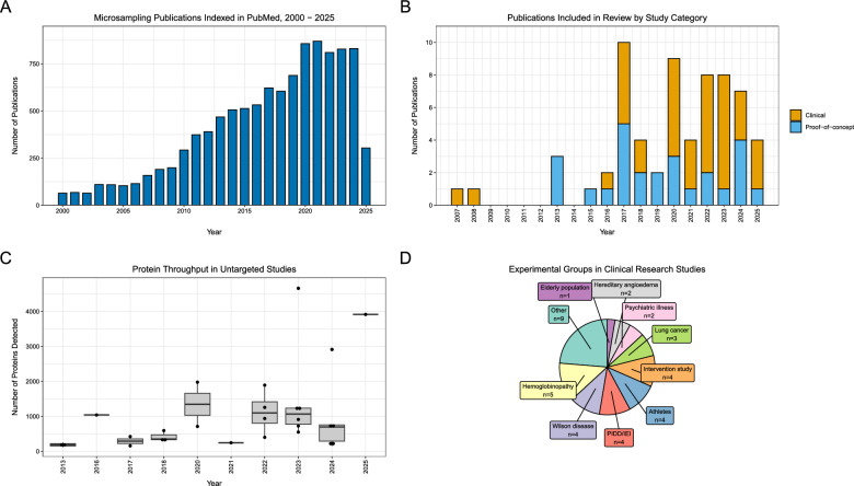 Results: A total of 209 records were screened for inclusion from database searches and 3157 records were screened from forward and backward citation searches, resulting in 64 eligible studies. An evaluation of proof-of-concept research within this field revealed that although microsamples are amenable to high-throughput proteomics using a variety of targeted and untargeted acquisition methods, quantification remained a relevant issue. Microsampling practices were heterogeneous, and no standard procedure existed for protein quantification. Clinical studies investigated protein expression in numerous disease or experimental groups, including hemoglobinopathies and immunodeficiency disorders.