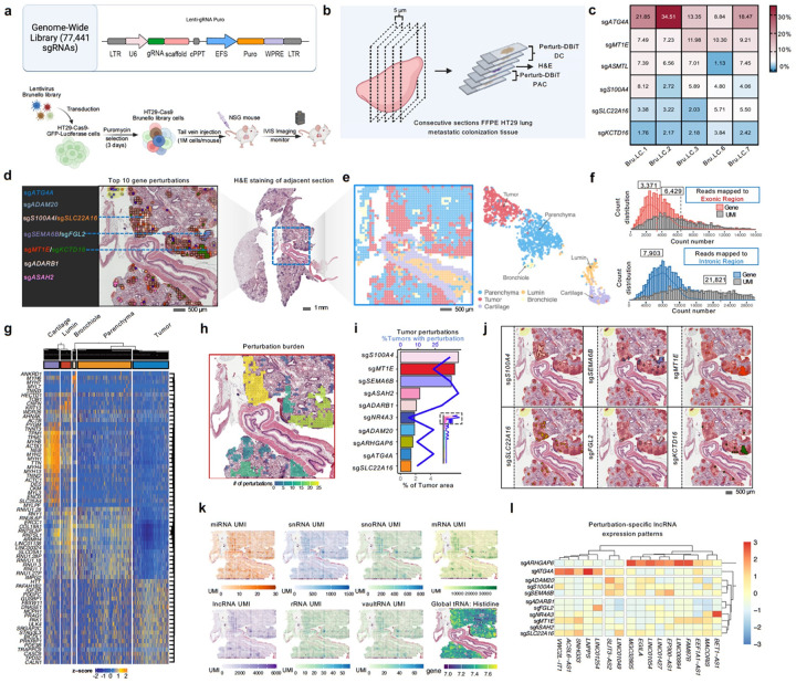 Spatially resolved in vivo CRISPR screening integrates gene editing with spatial transcriptomics to examine how genetic perturbations alter gene expression within native tissue environments. However, current methods are limited to small perturbation panels and the detection of a narrow subset of protein-coding RNAs. We present Perturb-DBiT, a distinct and versatile approach for the simultaneous co-sequencing of spatial total RNA whole-transcriptome and single-guide RNAs (sgRNAs), base-by-base, on the same tissue section. This method enables unbiased discovery of how genetic perturbations influence RNA regulation, cellular dynamics, and tissue architecture in situ. Applying Perturb-DBiT to a human cancer metastatic colonization model, we mapped large panels of sgRNAs across tumor colonies in consecutive tissue sections alongside their corresponding total RNA transcriptomes. This revealed novel insights into how perturbations affect long non-coding RNA (lncRNA) co-variation, microRNA-mRNA interactions, and global and distinct tRNA alterations in amino acid metabolism linked to tumor migration and growth. By integrating transcriptional pseudotime trajectories, we further uncovered the impact of perturbations on clonal dynamics and cooperation. In an immune-competent syngeneic mouse model, Perturb-DBiT enabled investigation of genetic perturbations within the tumor immune microenvironment, revealing distinct and synergistic effects on immune infiltration and suppression. Perturb-DBiT provides a spatially resolved comprehensive view of how genetic knockouts influence diverse molecular and cellular responses including small and large RNA regulation, tumor proliferation, migration, metastasis, and immune interactions, offering a panoramic perspective on perturbation responses in complex tissues.