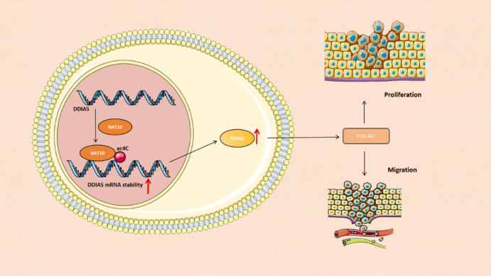 Primary liver cancer (PLC) is a prevalent tumor globally, ranking third in cancer-related mortality. The role of N4-acetylcysteine (ac4C) and N-acetyltransferase 10 (NAT10) in hepatocellular carcinoma (HCC) progression, migration, and invasion requires further elucidation. High NAT10 expression correlated with poor prognosis in HCC patients. Knockdown of NAT10 hindered HCC cell proliferation. AcRIP-seq screening revealed DDIAS as a significant downstream target of NAT10. Decreased NAT10 levels reduced DDIAS mRNA stability, leading to decreased proliferation, migration, and invasion of HCC cells upon DDIAS knockdown. Ectopic expression of DDIAS counteracted the effects of NAT10 knockdown by modulating the PI3K/AKT pathway. NAT10 was found to be elevated in HCC tissues compared to normal tissues, promoting HCC progression and correlating with shorter overall survival in patients. Mechanistically, NAT10 regulated HCC progression through the ac4C-DDIAS-PI3K-AKT axis.