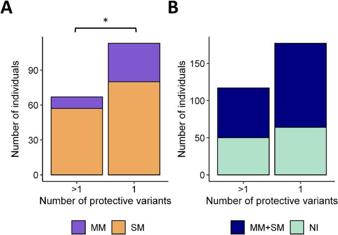 Malaria has exerted potent selective pressure on the human genome over millennia and has been a significant force in shaping human evolution. We have determined in 424 individuals living in malaria-hyperendemic areas in Ghana and in the Democratic Republic of Congo, the genotypes at the loci PIEZO1, G6PD, HBB, and PKLR. By qPCR we have also estimated P. falciparum parasitemia in all these subjects. We found that 41% of individuals tested had one protective variant, 20.5% two variants, 6.4% three variants, and 0.7% four variants. We have confirmed that Pz_E756del, G6pd A-, and HbS are associated with lower parasite density. The highest allele frequency was that of Pz_E756del, approaching 0.2, and we found that it is in linkage disequilibrium with Pz_E750Q. While overall malaria prevalence did not differ significantly among the groups, non-pregnant individuals with multiple protective alleles had lower rates of high-density parasitaemia, suggesting an additive effect of these variants against severe malaria infection, while pregnancy showed different allele protection profile. The high frequency of individuals carrying two or more protective polymorphisms might have implications for malaria transmission and parasite reservoir maintenance. Thus, the significance of additive or possibly synergistic effects of multiple protective genes co-existing in the same person deserves further investigation.