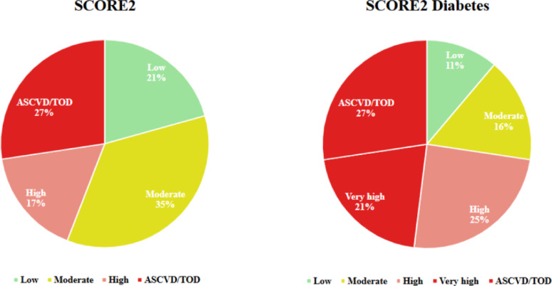 Conclusions: Higher PWV, IMT, and carotid atherosclerosis prevalence were associated with increasing CV risk stratified by SCORE2-Diabetes, with no significant differences between the very high and ASCVD/TOD groups. SCORE2-Diabetes demonstrated a better identification of preclinical vascular damage compared to SCORE2, supporting its use as a reliable tool for identifying vascular damage in T2D patients without ASCVD or TOD.