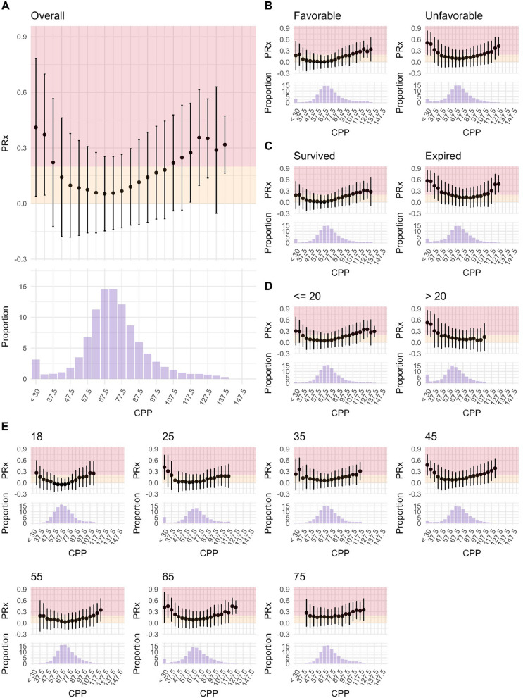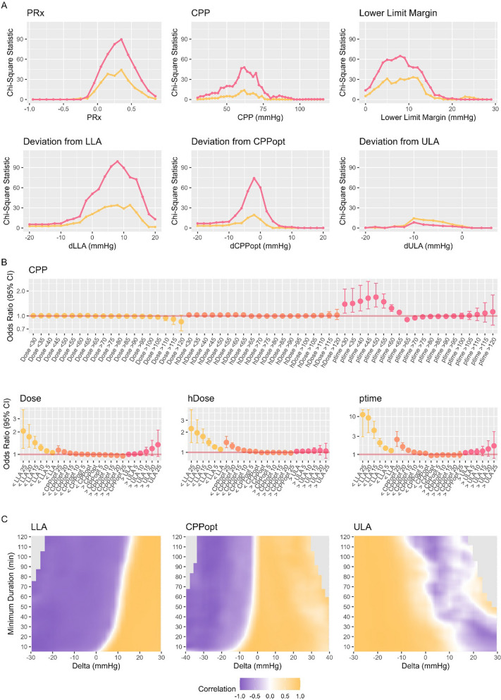Results: Our data confirms an asymmetric CPP/PRx relationship with steeper increases in PRx with decreasing and only modest elevations with increasing CPP. Even small decreases below CPPopt were consistently linked to worse outcomes (OR 1.04 (CI 1.02-1.06) and 1.09 (CI 1.04-1.15) for hourly dose and percentage time spent below CPPopt, p < 0.001 and p = 0.001 respectively). The strength of association increased with further decreases in CPP away from CPPopt towards the LLA with OR of 1.11 (CI 1.07-1.14) and 1.26 (CI 1.18-1.35) for hourly dose and percentage time spent below LLA respectively (p < 0.001). Conversely, higher-than CPPopt levels generally showed no association to worse outcomes. Distinct trajectories in the relationship between CPPopt and LLA (introduced as the Lower Limit Margin) could be identified with worse outcomes in those with decreasing distance between these targets (Mortality of 18% vs. 45% for patients with increasing vs. decreasing lower limit margins, p = 0.003).