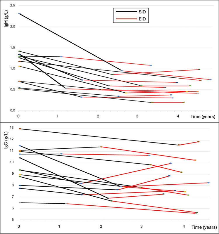 Results: Mean (SD) annualized changes in immunoglobulins during ocrelizumab treatment were IgM - 0.22 g/L/year (0.4), IgG - 0.38 g/L/year (0.9), IgA - 0.03 g/L/year. Rates of self-reported infection increased significantly during the first 4 years of treatment. Infection rates were not only associated with total immunoglobulin levels but also independently associated with age, comorbidity and female sex. We demonstrated for the first time that 29 out of 34 (87%) people on ocrelizumab with IgG in the lower normal range had sub-protective antibody responses to pneumococcus / haemophilus influenzae.