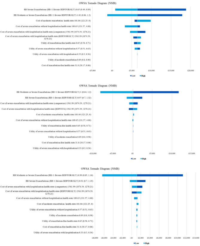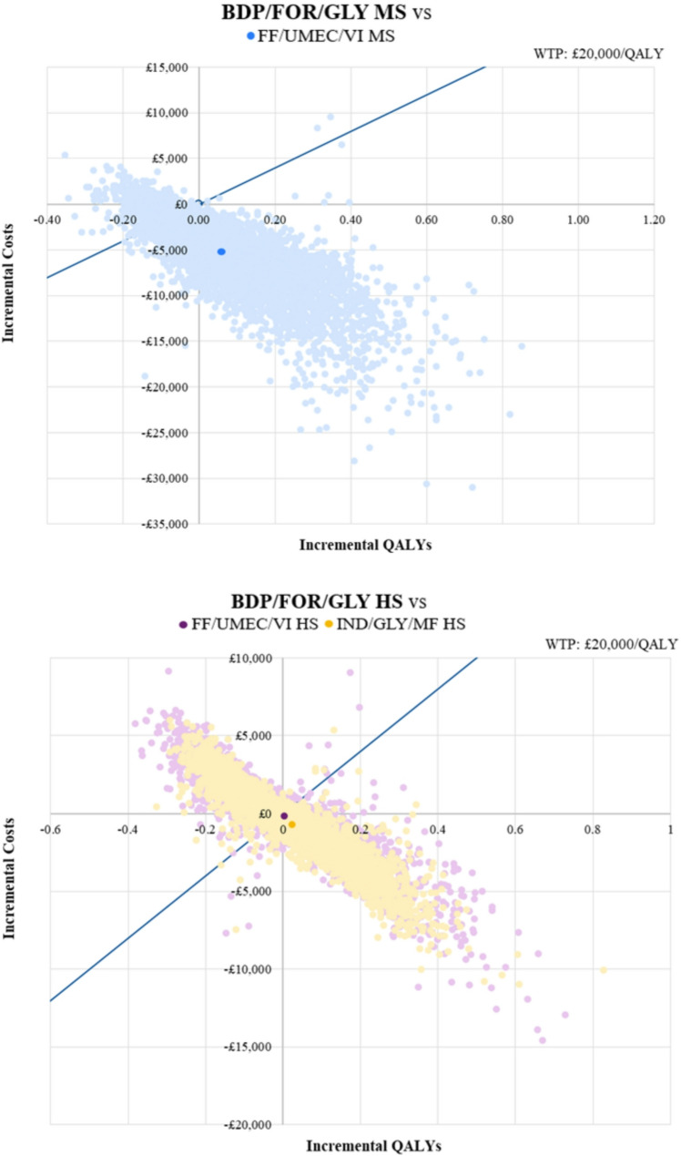 Results: BDP/FOR/GLY MS was projected to be a dominant treatment alternative against FF/UMEC/VI MS (£5,121 less costly, gained 0.065 additional QALYs). Similarly, BDP/FOR/GLY HS was a dominant treatment alternative against FF/UMEC/VI HS (£143, 0.003 additional QALYs) and IND/GLY/MF HS (£692 less costly, gained 0.023 additional QALYs). BDP/FOR/GLY MS and HS had 77.1%, 51.3%, and 61.2% likelihoods to be cost-effective vs. FF/UMEC/VI MS, FF/UMEC/VI HS, and IND/GLY/MF HS at the defined willingness-to-pay (WTP) threshold of £20,000 per QALY gained, respectively.