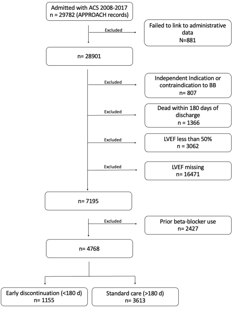 Objectives: The authors conducted a retrospective cohort study using linked registry and administrative data to evaluate whether early BB discontinuation (a prescription ending within 180 days of discharge) is associated with clinical outcomes.