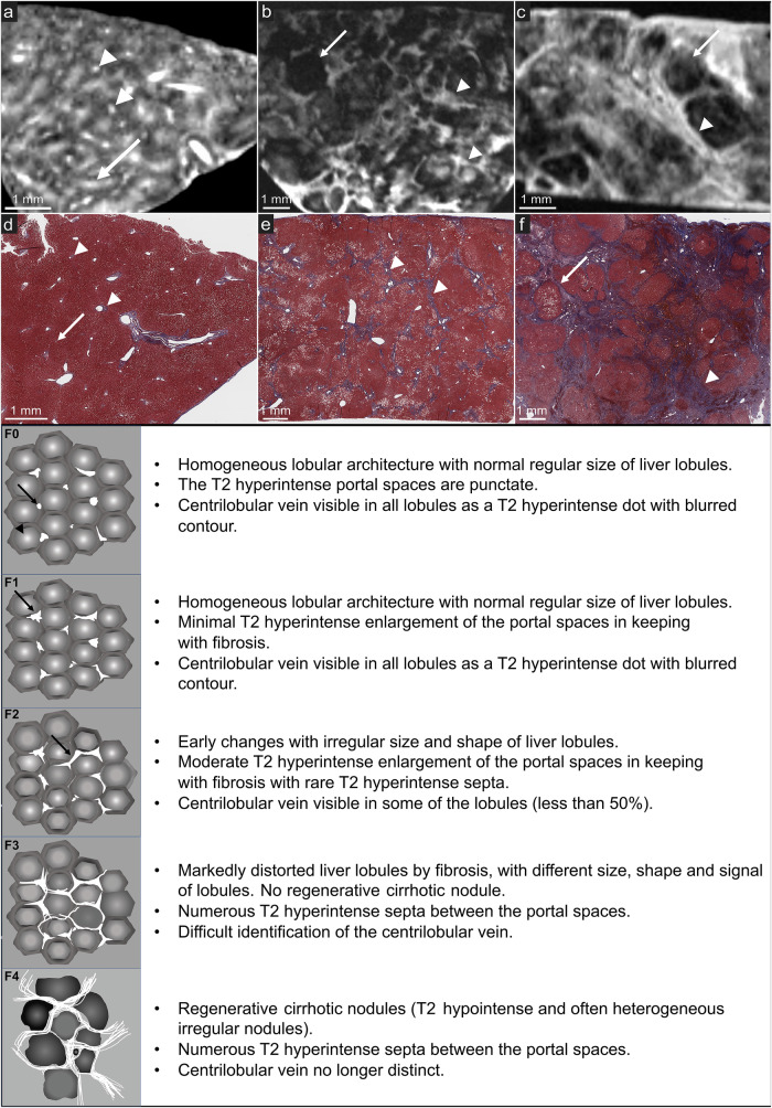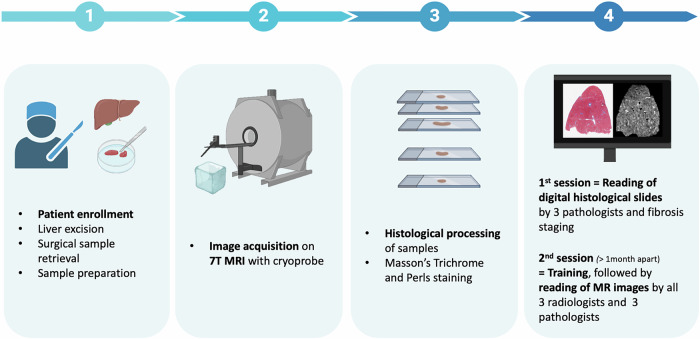 Methods: We prospectively enrolled 20 patients undergoing surgical liver resection between November 2021 and April 2023. Each ex vivo fresh liver tissue specimen (~ 1 cm3) was sectioned in half. The first half, stained using Masson's Trichrome and Perls, was assessed by three pathologists using the METAVIR score (reference standard). The second half was imaged with 7-T MRI using a cryoprobe (fat-suppressed T2-weighted turbo/fast spin-echo sequence, spatial resolution 75 × 75 × 200 µm3) and assessed by three radiologists and the same three pathologists, using a newly developed MRI-METAVIR score.