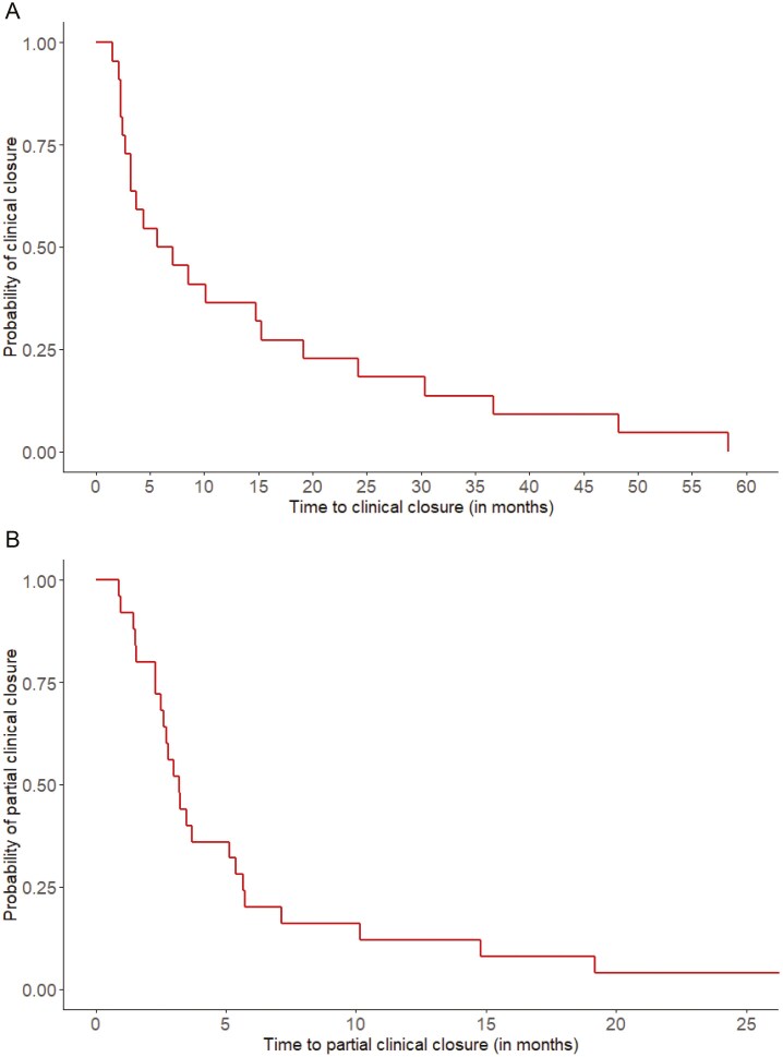 Methods: Adult patients with therapy-refractory pCD (failure to anti-tumor necrosis factor [TNF] therapy and/or fistula surgery), who underwent fistula curettage, closure of the internal fistula orifice, and autologous PRS injection in a Dutch tertiary referral center were included in an earlier conducted pilot study (n = 25). The primary outcome was complete clinical closure at long-term follow-up (closure of all treated external opening[s]). Secondary outcomes were partial clinical closure (closure of ≥1 treated external opening[s]), radiologic healing (fibrotic fistula tract on magnetic resonance imaging), and recurrence.