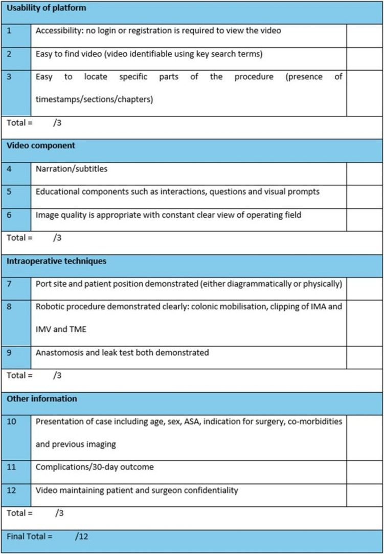 Methods: The checklist was developed by using existing society guidelines, such as the European Academy of Robotic Colorectal Surgery, comprising four key sections: (i) usability of the platform, (ii) video component, (iii) intraoperative techniques and (iv) other information (including case presentation and outcomes). Videos were identified using the search terms 'Robotic TME' from surgical education platforms (WebSurg, C-SATS and Touch Surgery) and YouTube, between January 2016 and July 2024. All videos displaying robotic TME were reviewed and scored using the quality assessment tool (/12), and the videos across the platforms were subsequently compared.