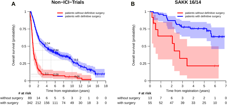 Conclusions: In our pooled analysis, patients with definitive surgery had higher survival rates than those without definitive surgery. Prognosis in patients without definitive surgery seems to have improved in the era of ICI.