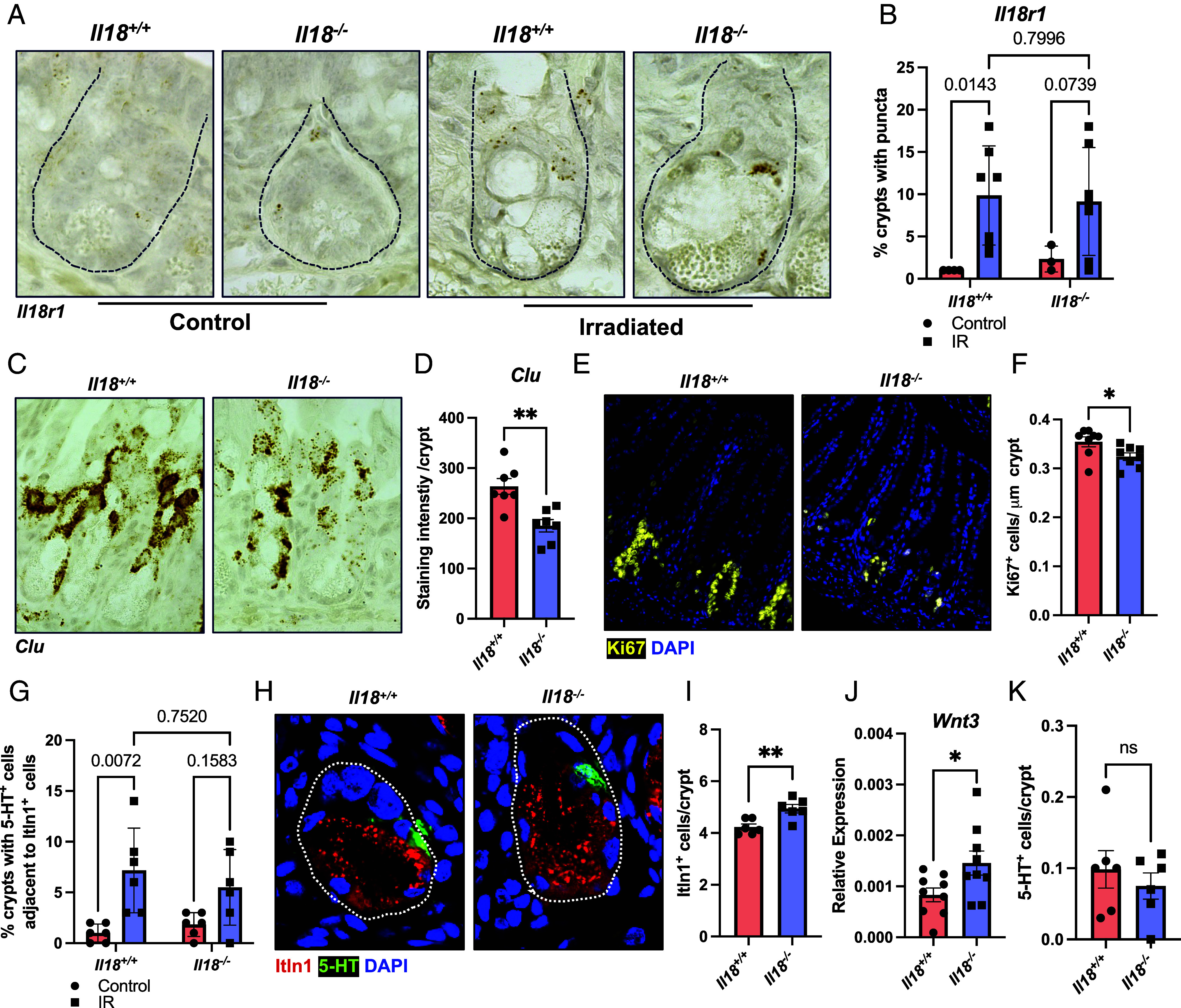 Keywords: IL-18 receptor; enterochromaffin cells; inflammasomes; intestinal injury; revival stem cells.