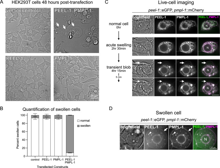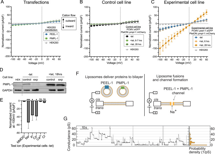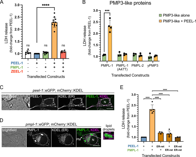 Toxin-antidote systems are selfish genetic elements composed of a linked toxin and antidote. The peel-1 zeel-1 toxin-antidote system in C. elegans consists of a transmembrane toxin protein PEEL-1 which acts cell autonomously to kill cells. Here we investigate the molecular mechanism of PEEL-1 toxicity. We find that PEEL-1 requires a small membrane protein, PMPL-1, for toxicity. Together, PEEL-1 and PMPL-1 are sufficient for toxicity in a heterologous system, HEK293T cells, and cause cell swelling and increased cell permeability to monovalent cations. Using purified proteins, we show that PEEL-1 and PMPL-1 allow ion flux through lipid bilayers and generate currents which resemble ion channel gating. Our work suggests that PEEL-1 kills cells by co-opting PMPL-1 and creating a cation channel.