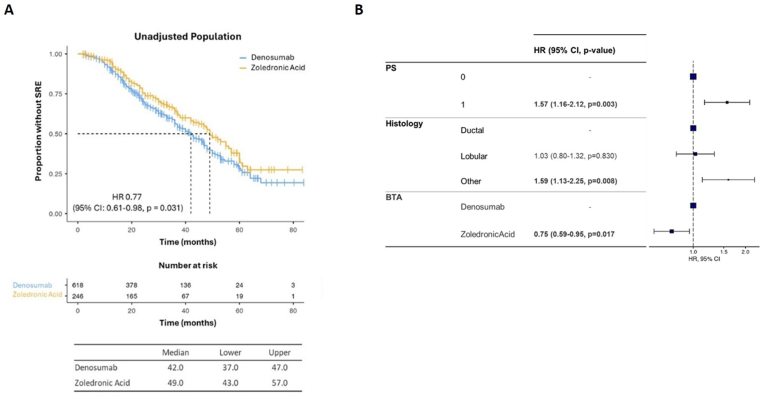 A comparative analysis of Denosumab (DMAB) and Zoledronic Acid (ZA) was conducted in a real-world cohort of 864 patients with hormone receptor-positive, human epidermal growth factor receptor 2-negative advanced breast cancer with bone metastases, who were undergoing CDK4/6 inhibitors plus endocrine therapy. We evaluated the time to first skeletal-related events (SREs), progression-free survival (PFS), and overall survival (OS). To adjust for confounding variables, we utilized propensity score matching (PSM) and inverse probability of treatment weighting (IPTW) methodologies. In the unadjusted cohort, ZA was associated with a longer time to first SRE compared to DMAB (HR = 0.77, 95 % CI: 0.61-0.98, p = 0.031). Similar results were obtained in both the PSM (HR = 0.69, 95 % CI: 0.52-0.92, p = 0.011) and IPTW cohorts (HR = 0.74, 95 % CI: 0.63-0.87, p < 0.001), with ZA-treated patients showing an extended time to first SRE compared to those treated with DMAB. No differences in PFS and OS were observed between the two cohorts.