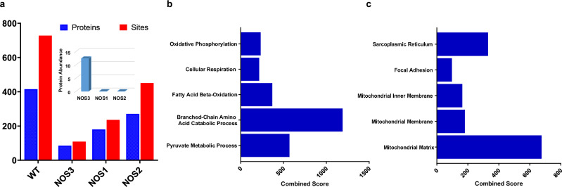 Diminished bioavailability of nitric oxide (NO) contributes to the pathogenesis of cardiometabolic disorders. However, the alterations in signaling under NO deficiency remain mostly unknown. We combined genetics and proteomics to quantify changes in the heart proteome, phosphoproteome, and S-nitrosocysteine proteome in mice lacking nitric oxide synthases (NOS1, NOS2, NOS3), lacking all three enzymes (tNOS), or the alpha 1-regulatory subunit of the soluble guanylate cyclase (sGCα1). Modest changes of less than 1% in the proteome and 4% in the phosphoproteome in single NOS gene or sGCα1 null mouse hearts indicate sufficient biological compensation. In contrast, the number of S-nitrosylated proteins declined by 80%, 57%, and 35% in NOS3, NOS1, and NOS2 null mice, respectively. A 21% remodeling of the proteome and 9% of the phosphoproteome in the tNOS null mice included integral kinases that provide adaptive rewiring of signaling. The data revealed the emergence of enhanced mitogen-activated-kinases Mapk3/Mapk1 signaling, documented by increased phosphorylation of these kinases and their downstream targets. The data highlight that adaptive compensation of signaling prevents overt phenotypes during NO signaling deficits. In contrast, maladaptive signaling via Mapk3/Mapk1 may promote pathological cardiomyopathy that progressively develops in the tNOS null mice.