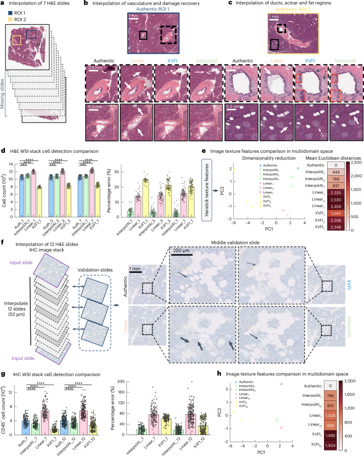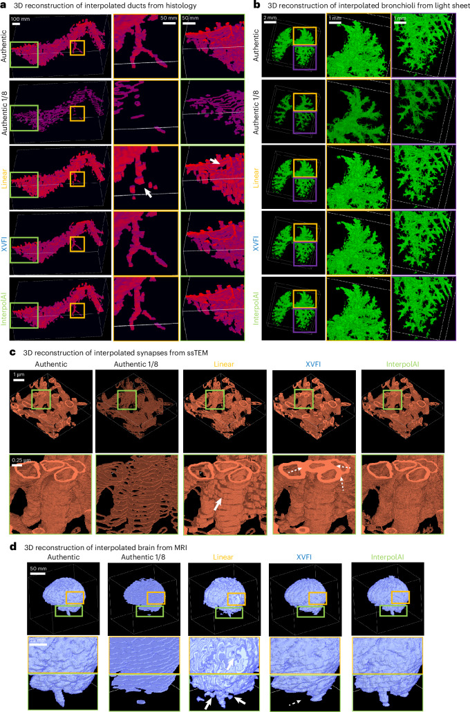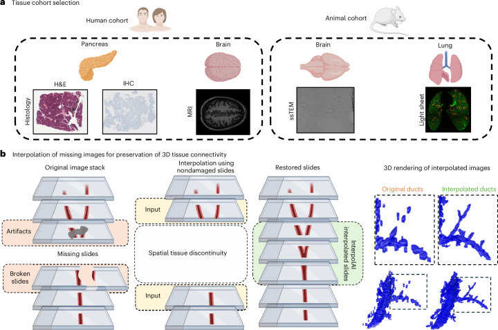 Recent advances in imaging and computation have enabled analysis of large three-dimensional (3D) biological datasets, revealing spatial composition, morphology, cellular interactions and rare events. However, the accuracy of these analyses is limited by image quality, which can be compromised by missing data, tissue damage or low resolution due to mechanical, temporal or financial constraints. Here, we introduce InterpolAI, a method for interpolation of synthetic images between pairs of authentic images in a stack of images, by leveraging frame interpolation for large image motion, an optical flow-based artificial intelligence (AI) model. InterpolAI outperforms both linear interpolation and state-of-the-art optical flow-based method XVFI, preserving microanatomical features and cell counts, and image contrast, variance and luminance. InterpolAI repairs tissue damages and reduces stitching artifacts. We validated InterpolAI across multiple imaging modalities, species, staining techniques and pixel resolutions. This work demonstrates the potential of AI in improving the resolution, throughput and quality of image datasets to enable improved 3D imaging.