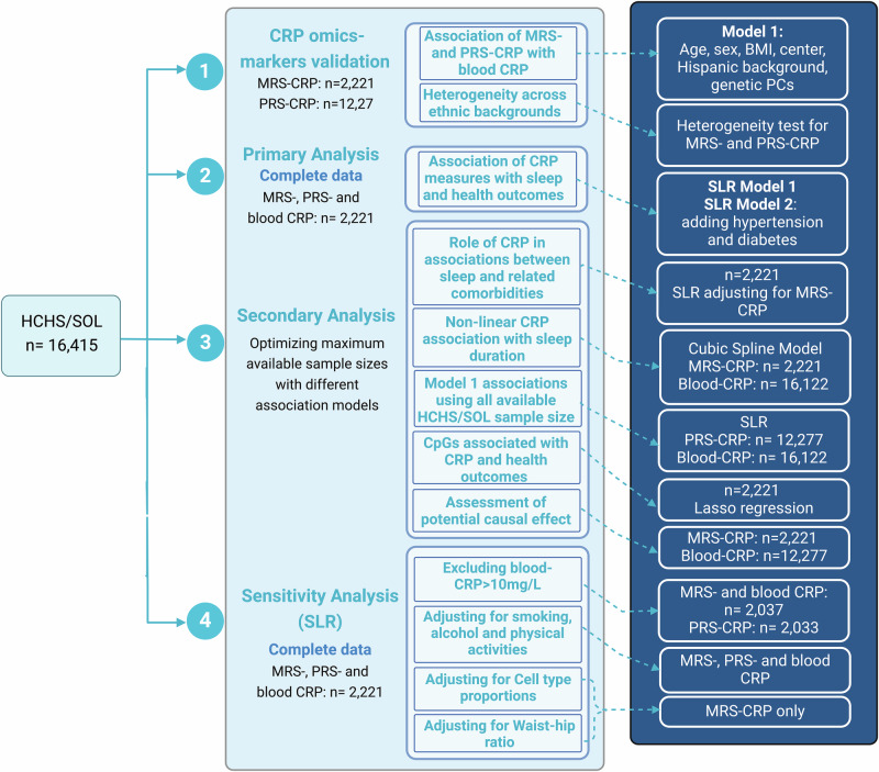 C-reactive protein (CRP) reflects inflammation status and is linked to poor sleep, metabolic and cardiovascular health. Methylation (MRS) and polygenic risk scores (PRS) reflect long-term systemic inflammation, and genetically-determined CRP, respectively. To refine understanding of inflammation-linked sleep and health outcomes, we construct PRS-CRPs using GWAS summary statistics and a previously-developed MRS-CRP in the Hispanic Community Health Study/Study of Latinos. Via survey-weighted linear regression, we estimate associations between blood-, PRS-, and MRS-CRP, with multiple sleep and health outcomes (n = 2217). MRS-CRP and PRS-CRPs are associated with increasing blood-CRP level by 43% and 23% per standard deviation. MRS-CRP is associated with obstructive sleep apnea (OSA) traits, long sleep duration, diabetes and hypertension, while PRS-CRPs were not. Blood-CRP level is associated with sleep duration and diabetes. Adjusting for MRS-CRP weakens OSA-diabetes/hypertension associations. Consequently, MRS-CRP is a stronger marker than blood-CRP and PRS-CRP to systemic inflammation associated with poor sleep and related comorbidities.