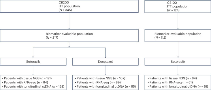Molecular determinants of KRAS(G12C)inhibitor efficacy in KRASG12C-mutated non-small-cell lung cancer (NSCLC) remain poorly characterized. Here we report one of the largest integrated analyses to date of sotorasib clinical efficacy biomarkers from the phase 2 CodeBreaK 100 and phase 3 CodeBreaK 200 studies. We reveal differential sotorasib activity and relative benefit compared to docetaxel across KRASG12C-mutated NSCLC co-mutational subsets and transcriptional subtypes. We also identify low expression of TTF1 and KEAP1 co-mutations/NRF2 activation as major determinants of sotorasib anti-tumor efficacy and adverse prognostic features. Exploratory analyses highlight potential tumor cell-extrinsic contributors to sotorasib anti-tumor activity and suggest that early on-treatment clearance of KRASG12C- circulating tumor DNA may refine clinical response prediction algorithms. Our findings advance precision medicine for patients with KRASG12C-mutated NSCLC and establish a framework for patient stratification and selection for treatment intensification with rationally applied therapeutic combinations.
