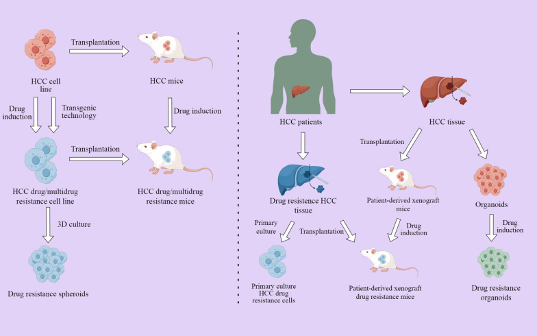 Hepatocellular carcinoma (HCC) is the second leading cause of cancer-related death worldwide. Although drug therapy has been well developed and applied, its clinical efficacy is limited due to primary or acquired drug resistance in most HCC patients. Therefore, it is of great clinical significance to elucidate the key molecular mechanisms of resistance and improve the sensitivity of HCC cells to drugs. At present, a variety of HCC drug resistance models have been developed to find out resistance mechanisms, screen biomarkers, and explore strategies to reverse drug resistance, including traditional HCC drug resistance models, HCC patient-derived drug resistance models, three-dimensional drug resistance models, transgenic drug resistance models, and multi-drug resistance models. Here, we searched PubMed, Embase and Web of science for studies related to HCC drug resistance models in recent years, systematically summarized the established methods and characteristics of these models, reviewed their applications and compared their advantages and disadvantages, aiming to provide reference for the selection of appropriate models for HCC drug resistance research.