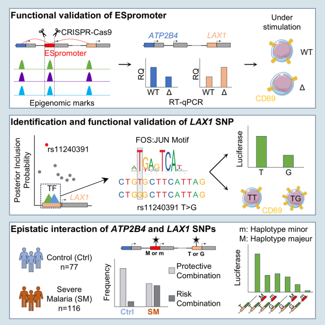 Regulation of gene expression has recently been complicated by identifying Epromoters, a subset of promoters with enhancer function. Here, we uncovered a dual cis-regulatory element, "ESpromoter," exhibiting both enhancer and silencer function as a regulator of the nearby genes ATP2B4 and LAX1 in single human T cells. Through an integrative approach, we pinpointed functional rs11240391, a severe malaria-risk variant that escapes detection in genome-wide association studies, challenging conventional strategies for identifying causal variants. CRISPR-modified cells demonstrated the regulatory effect of ESpromoter and rs11240391 on LAX1 expression and T cell activation. Furthermore, our findings revealed an epistatic interaction between ESpromoter SNPs and rs11240391, impacting severe malaria susceptibility by further reducing LAX1 expression. This groundbreaking discovery challenges the conventional enhancer-silencer dichotomy. It highlights the sophistication of transcriptional regulation and argues for an integrated approach combining genetics, epigenetics, and genomics to identify new therapeutic targets for complex diseases.