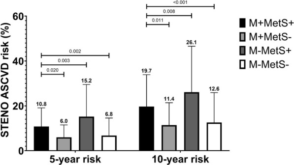 Methods: Adults with T1D (n = 659) were consecutively screened for liver steatosis via abdominal ultrasound. The presence of macrovascular disease (including coronary artery disease [CAD], peripheral artery disease [PAD], or ischaemic stroke [CVA, cerebrovascular accident]) was identified via electronic medical records. The 5- and 10-year risks of fatal/nonfatal ASCVD were assessed via the Steno Type 1 Risk Engine. Insulin resistance was assessed via the estimated glucose disposal rate (eGDR).