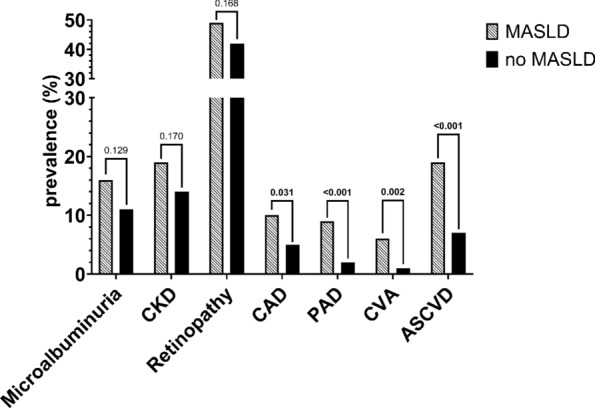 Results: The MASLD prevalence was 16.8%. The prevalence of composite ASCVD (18.9 vs. 6.8%, p < 0.001), CAD (9.9 vs. 4.7%, p = 0.031), PAD (9.0 vs. 2.2%, p < 0.001) and CVA (6.3 vs. 1.1%, p = 0.002) was greater in people with MASLD. The 5-year (7.8 [2.1-14.4] vs. 4.8 [1.6-12.0]%, p = 0.034) and 10-year (15.0 [4.1-26.8] vs. 9.4 [3.1-22.5]%, p = 0.035) risks of ASCVD were greater in those with MASLD. MASLD was associated with prevalent ASCVD (adjusted OR 4.26, 95% CI 1.79-10.11, p < 0.001), independent of age, sex, diabetes duration, smoking, statin use, LDL-cholesterol, the glomerular filtration rate, albuminuria, and metabolic syndrome.
