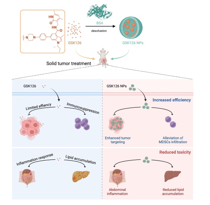 Results: The prepared GSK126 NPs exhibited a small spherical core with an average diameter of 30.09 nm ± 1.55 nm, high drug loading capacity (16.59% ± 2.86%) and good entrapment efficiency (99.53% ± 0.208%). GSK126 NPs decreased tumor weight and volume in the B16F10 xenograft mice, while such effects were not observed in the free GSK126 group. Subsequently, histological analysis demonstrated that GSK126 NPs significantly alleviated lipid-associated liver toxicity. Additionally, GSK126 NPs can partially counteract the effects of GSK126 on MDSCs, particularly by decreasing the infiltration of M-MDSCs into tumors.