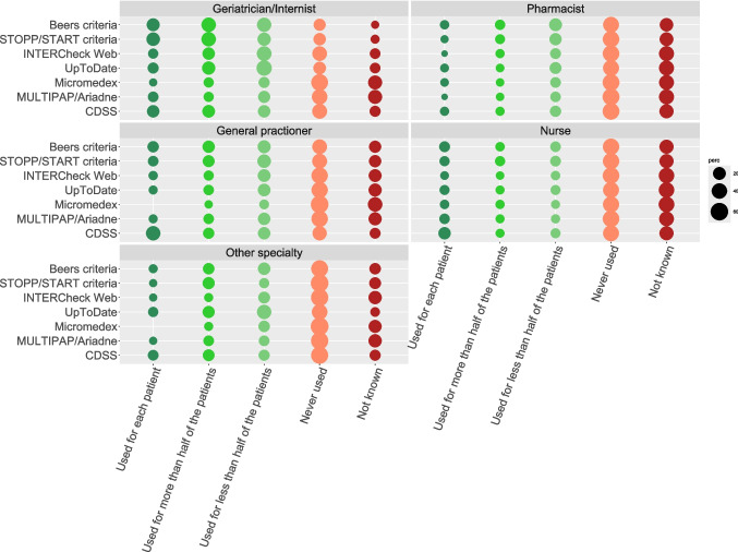Results: The survey collected 657 responses from pharmacists (35%), nurses (26%), general practitioners (22%), geriatricians/internists (9%), and other physicians (8%). The Beers and STOPP/START criteria were used by 38% and 34% of participants, respectively, with geriatricians and other physicians being the primary users. Additionally, 34% of participants reported using specific software integrated into their institutional computer systems. Among 294 respondents identifying barriers to appropriate prescribing, the most common were lack of time (14%), lack of knowledge (10%), and accessibility/costs of digital tools (8%). Key facilitators included specific training (38%), integrated software/apps (29%), and more time with patients (11%).
