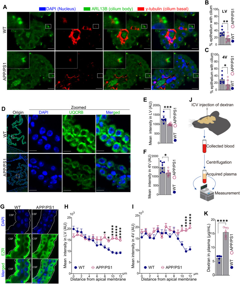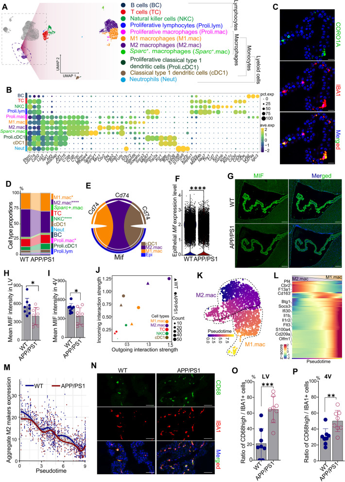 Results: We constructed a comprehensive atlas of ChP at single-cell resolution and identified six major cell types and immune subclusters in male mice. The majority of dysregulated genes were found in the epithelial cells of APP/PS1 mice in comparison to wild-type (WT) mice, and most of these genes belonged to down-regulated module involved in mitochondrial respirasome assembly, cilium organization, and barrier integrity. The disruption of the epithelial barrier resulted in the downregulation of macrophage migration inhibitory factor (MIF) secretion in APP/PS1 mice, leading to macrophage activation and increased phagocytosis of Aβ. Concurrently, ligands (e.g., APOE) secreted by macrophages and other ChP cells facilitated the entry of lipids into ependymal cells, leading to lipid accumulation and the activation of microglia in the brain parenchyma in APP/PS1 mice compared to WT controls.