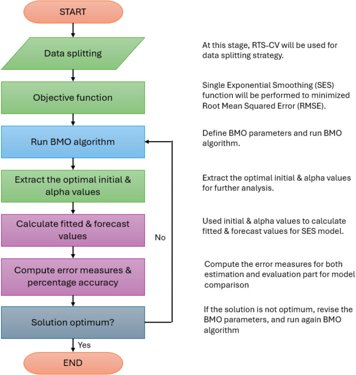 Keywords: BMO; Forecast accuracy; Forecasting model; Parameter optimization; SES; Single Exponential Smoothing – Barnacles Mating Optimizer (SES-BMO); Time series analysis.