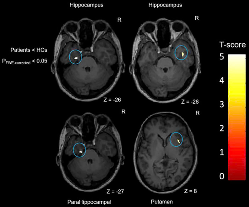 Results: Whole-brain analysis revealed no significant GMV differences between groups. However, ROIs analyses showed significantly smaller GMV in the bilateral hippocampus, left parahippocampal gyrus, and right putamen in the patient group. Additionally, GMV in the orbital part of the inferior frontal gyrus was negatively associated with pain duration.