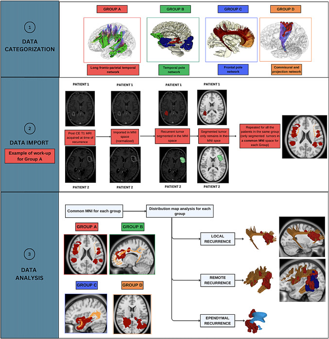 Methods: The study included patients with histopathologically confirmed recurrent HGGs who underwent reoperation. Primary tumors were categorized into four anatomical subgroups using a connectivity-based framework from the HCP 1065 Atlas: Subgroup A: Long Fronto-Temporo-Parietal Network Subgroup B: Temporal Pole Network (further divided into B1, B2, and B3 based on connectivity patterns) Subgroup C: Frontal Pole Network Subgroup D: Commissural and Projection Networks (further divided into D1 and D2). Recurrences were classified via post-contrast T1-weighted MRI as local, remote, ependymal. The Tract-to-Region Connectome (T-R-C) assessed the volumetric overlap between recurrence maps and main white matter bundles.