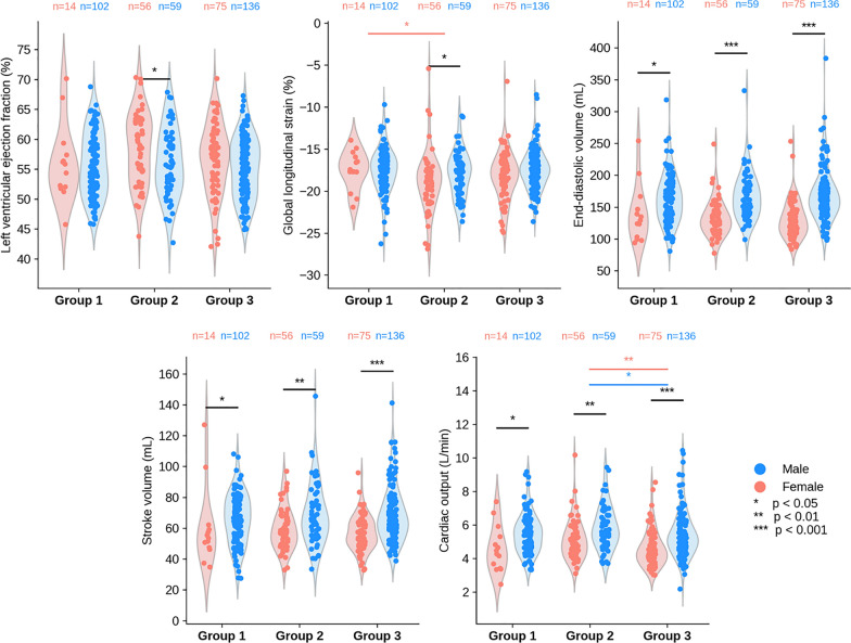 Results: We ascertained HFpEF in 445 participants, of which 299 (67%) were men and 146 (33%) women. The median age was 70 years old (interquartile range: [66.0-74.0]). A combination of hypertension and obesity was the most prevalent cardiometabolic pattern both in men and women with HFpEF. Most men had 2-3 clinical cardiometabolic comorbidities while most women had 1-2, despite a similar metabolic syndrome profile (p = 0.05). LCA revealed three distinct, clinically relevant phenogroups, namely (1) a most male and multimorbid group (n = 117); (2) a group with a high prevalence of severe obesity, abnormal waist circumference and with the highest relative proportion of females (n = 116); and finally (3) a group with an apparently lower comorbidity burden aside from hypertension (n = 212). There were significant differences in clinical measurements and medication across the three phenogroups identified. Cardiac output at rest was significantly higher in group 2 vs. group 3 (males: median 5.6 L/min vs. 5.2 L/min, p < 0.05; females: 5.1 L/min vs. 4.4 L/min, p < 0.01). Absolute global longitudinal strain was significantly lower in women in group 1 vs. group 2 (-17.6% vs. -18.5%, p < 0.05).