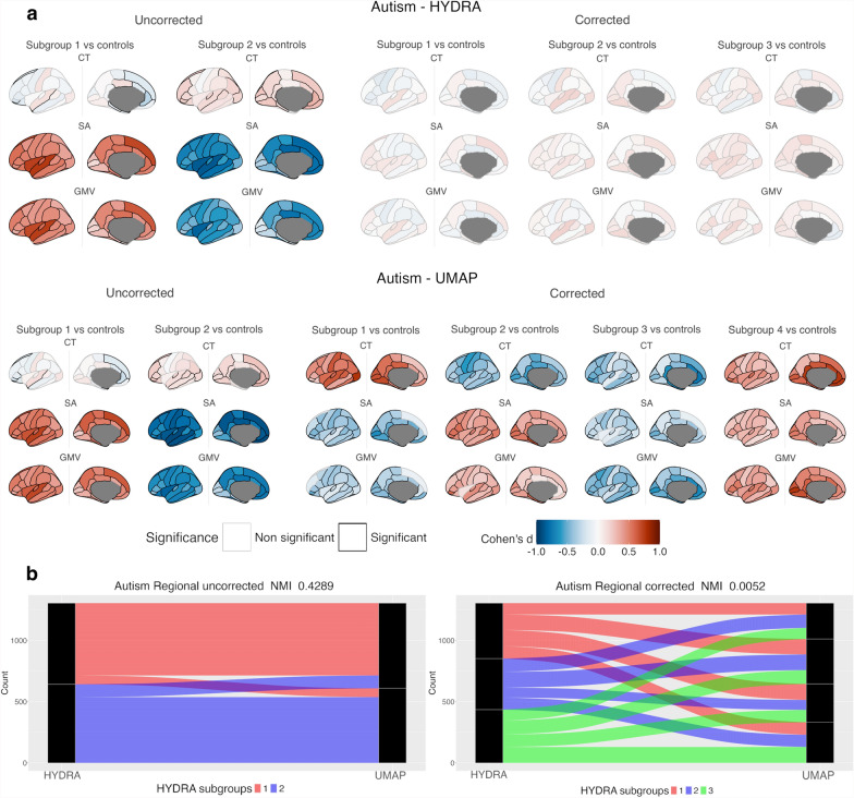 Methods: Here, we use population modelling to cluster a multi-site dataset based on global and regional centile scores of cortical thickness, surface area and grey matter volume. We use HYDRA, a novel semi-supervised machine learning algorithm which clusters based on differences to controls and compare its performance to a traditional clustering approach.