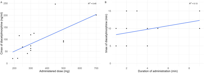 Results: In total, 14 patients were included in the study. The mean self-administered IN DAM dose was 346 mg (range 190-700 mg) delivered over a mean time of 3.8 min (range 1-9 min). IN DAM elicited moderate-to-strong peak drug effects, with marked reductions in heroin craving and withdrawal symptoms. No clinically relevant respiratory depression or decrease in oxygenation saturation was observed. Subjective effects occurred rapidly within the first 2 min after the start of administration. These effects gradually increased and peaked at 30-35 min, which paralleled the rising plasma concentrations of DAM and 6-MAM, while the sustained heroin-like effects best correlated with morphine and morphine-6-glucuronide plasma concentrations. Plasma half-lives of diacetylmorphine and 6-monoacetylmorphine were longer, and time to maximal plasma concentration was later than previously reported, suggesting saturated absorption at high intranasal doses and volumes.