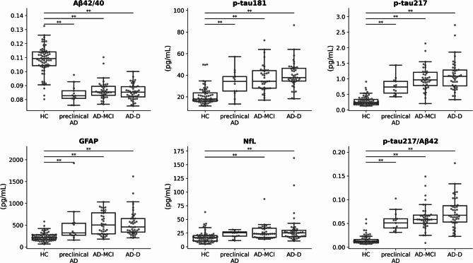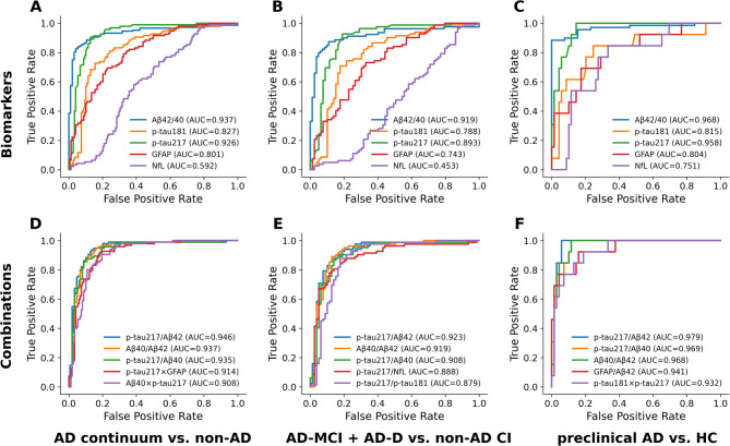 Methods: The assessed plasma biomarkers included Aβ42/40, phosphorylated tau (p-tau181 and p-tau217), glial fibrillary acidic protein (GFAP), and neurofilament light chain (NfL), individually and in combination. Aβ42/40 was measured using the HISCL® platform, while all other biomarkers were measured using the Simoa® platform. Participants were classified based on Aβ PET imaging and neuropsychological testing into healthy controls (HC), AD continuum (preclinical AD, mild cognitive impairment [AD-MCI], and mild dementia [AD-D]), and non-AD cognitive impairment (CI) groups. Receiver operating characteristic analyses were performed to predict the Aβ PET status, correlation with Centiloid (CL) values and cognitive scores, and biomarker comparisons across AD stages.