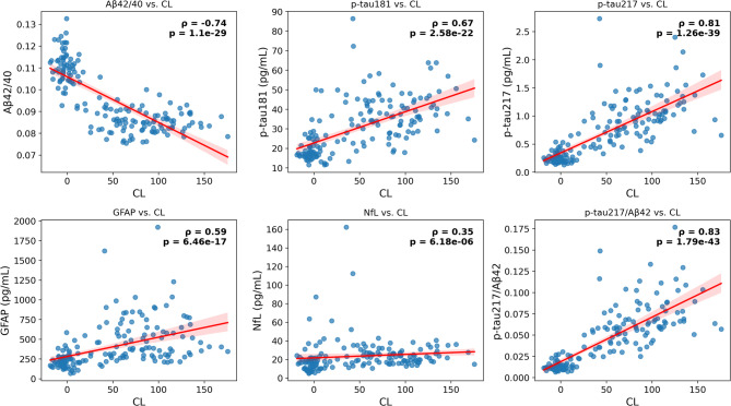 Results: Sixty-nine HC, 13 preclinical AD, 38 AD-MCI, 44 AD-D, and 79 non-AD CI participants were included. The area under the curves (AUCs) for predicting Aβ PET status were 0.937 (Aβ42/40), 0.926 (p-tau217), and 0.946 (p-tau217/Aβ42); results of pair-wise DeLong tests revealed no significant differences among these three metrics (all p > 0.05). In the cognitively normal group, the AUCs were 0.968 (Aβ42/40), 0.958 (p-tau217), and 0.979 (p-tau217/Aβ42), while in the cognitively impaired group, they were 0.919 (Aβ42/40), 0.893 (p-tau217), and 0.923 (p-tau217/Aβ42). Among HC and AD continuum participants, CL correlations were - 0.74 (Aβ42/40), 0.81 (p-tau217), and 0.83 (p-tau217/Aβ42). In the HC and AD continuum, Aβ42/40 levels showed a bimodal distribution (cutoff = 0.096), with a shift from high to low occurring at 19.3 CL, compared to the PET positivity threshold of 32.9 CL. P-tau217 exhibited a linear increase with disease progression. All biomarkers correlated strongly with logical memory scores.