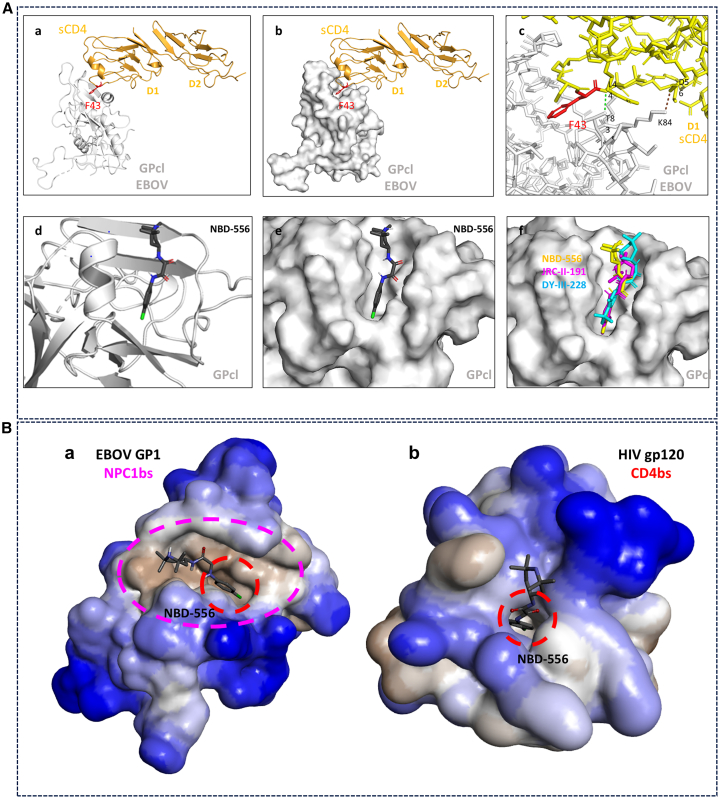 Human CD4 (cluster of differentiation 4) is well known as the primary receptor for human immunodeficiency virus (HIV) entry into the cells. The virus binds to CD4 molecules to induce a conformational change in the viral glycoprotein (GP) gp120, which exposes the co-receptor binding site for coreceptors CCR5 or CXCR4. The co-receptor binding then leads to membrane fusion for viral entry. Since the CD4 molecule has a high affinity for gp120, soluble CD4 (sCD4) and CD4-mimetic small molecules (CD4mcs) have been extensively studied as potential inhibitors for HIV infection. Surprisingly, we have found that human sCD4 and some CD4mcs are able to inhibit Ebola virus (EBOV) infection. Evidence is provided that the compounds block viral entry by targeting the GP binding site for the endosomal receptor Niemann-Pick C1 (NPC1). This finding reveals virus-receptor binding similarities between two remote viruses (HIV and EBOV) and suggests new possibilities for EBOV entry inhibitors.